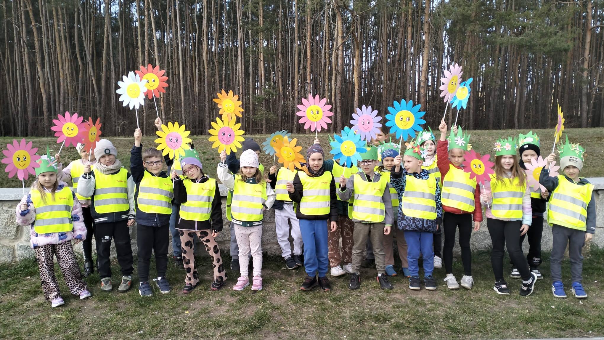 przedszkolaki z uśmiechem na twarzach śpiewały, witając wiosnę .